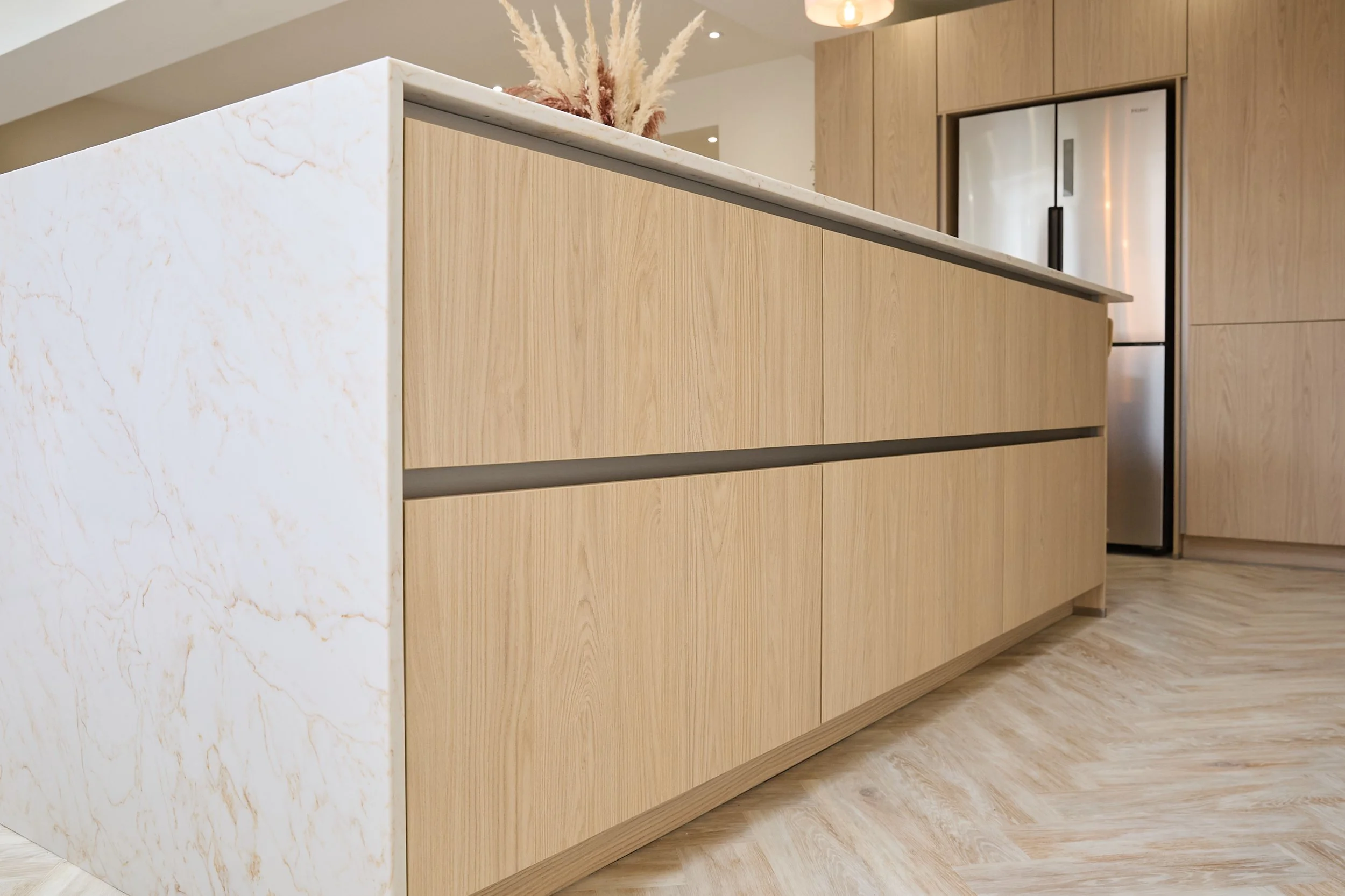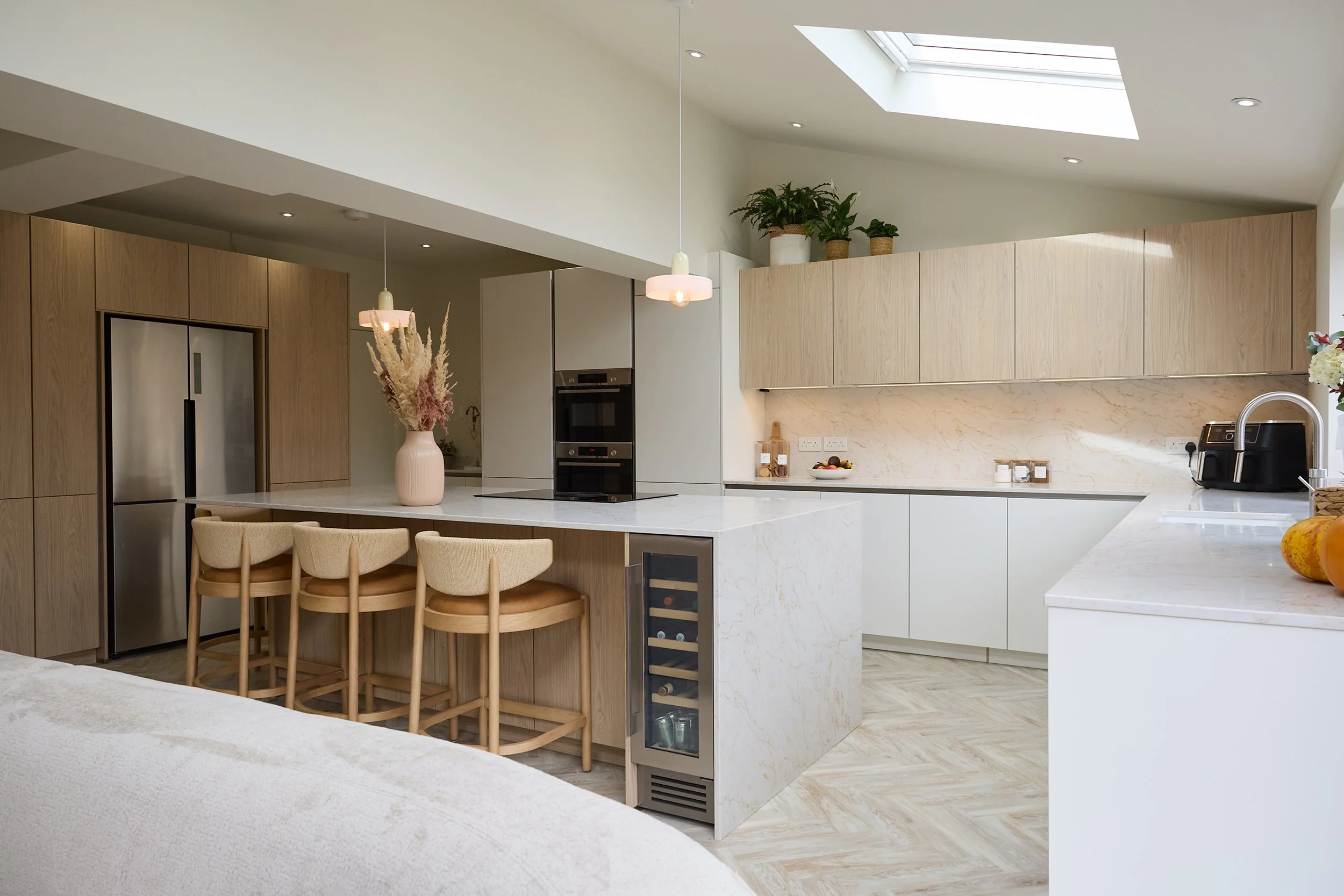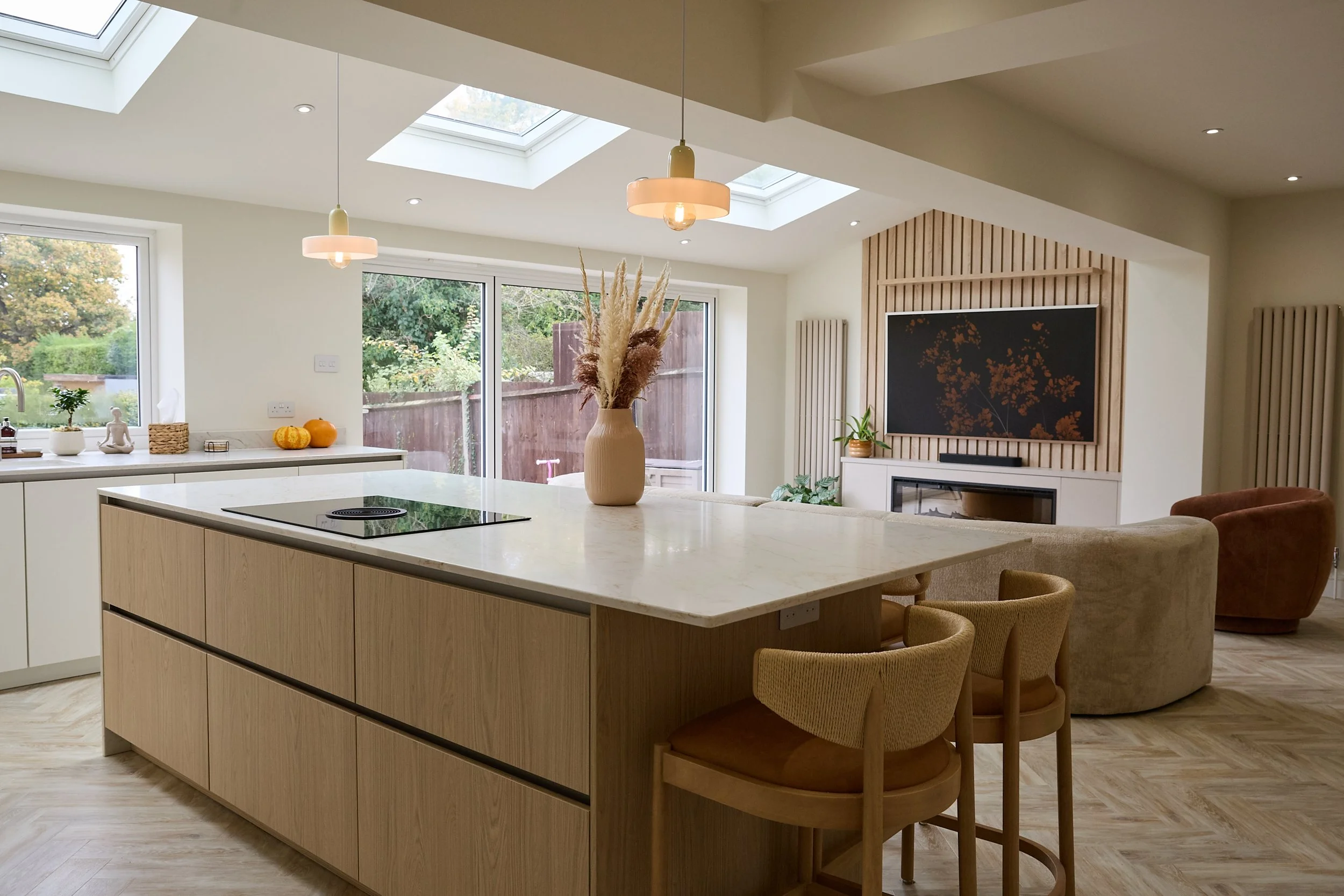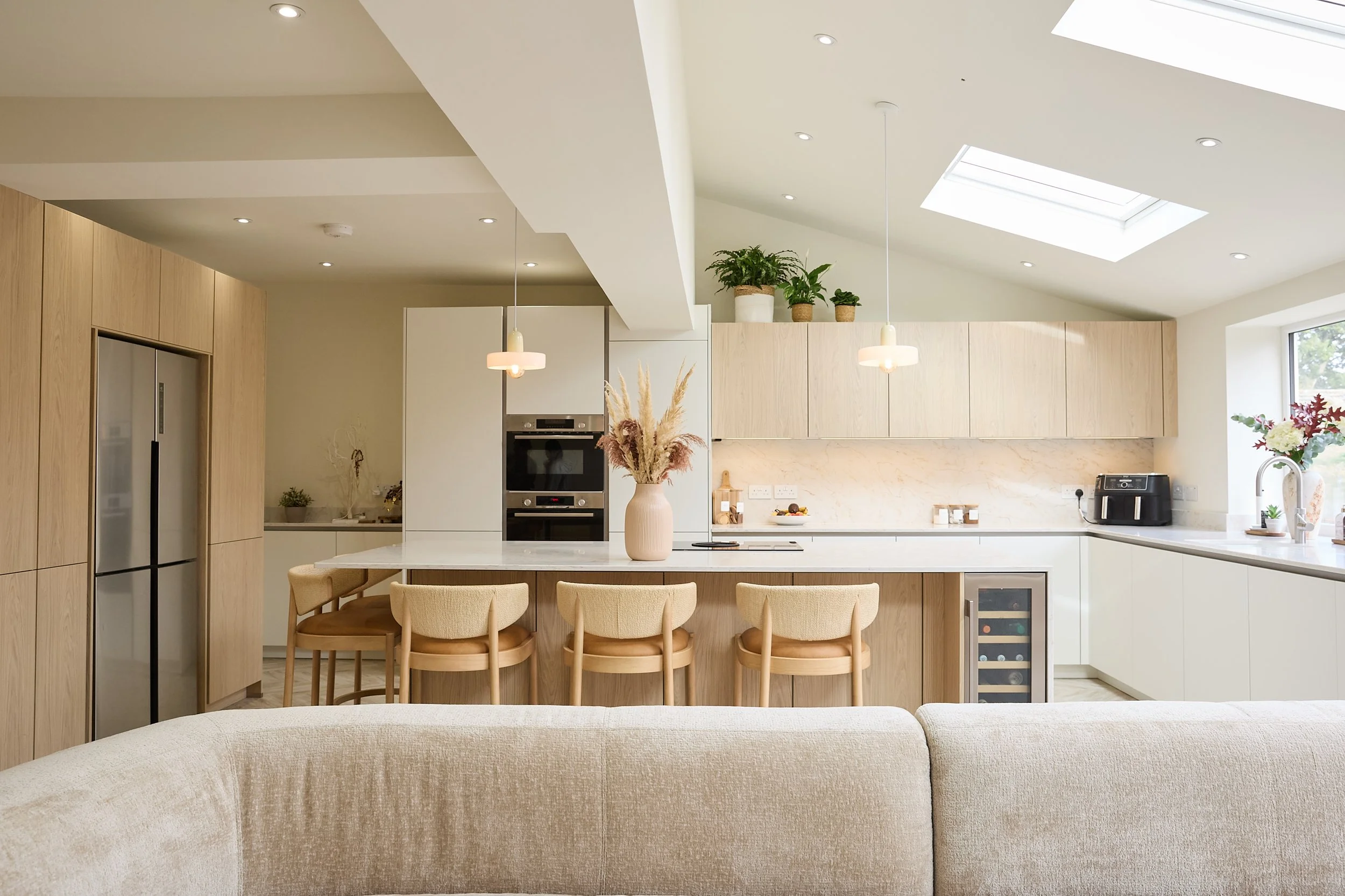 A calm and light-filled single storey extension, designed to create an open-plan kitchen and sitting area. The space features light wood cabinetry, matching flooring, and a bespoke wooden storage unit, all contributing to a warm and natural aesthetic. The result is a relaxed, contemporary environment that feels bright, inviting, and perfectly suited to modern living.